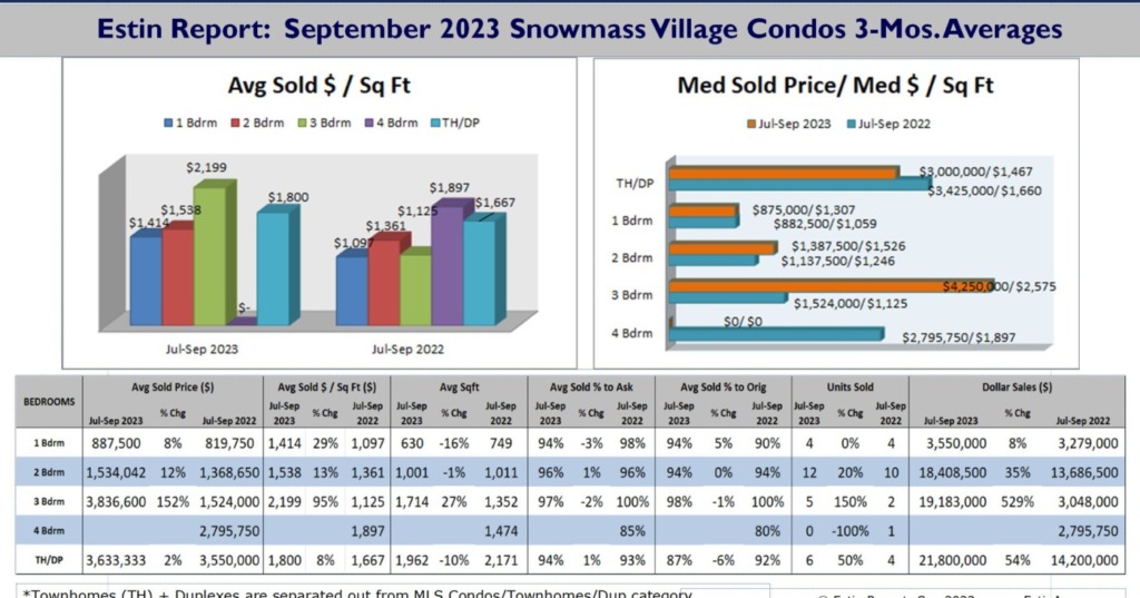 AUG 2023 – ASPEN AND SNOWMASS VILLAGE: MEDIAN PRICES AND MEDIAN SOLD PRICES PER SQ FT